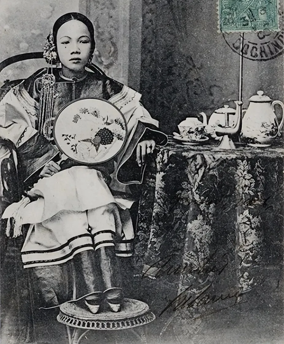 照片里的女子穿着传统服饰,手里拿着团扇,一双小得不自然的脚很特别,这就是当时被称为“三寸金莲”的缠足。