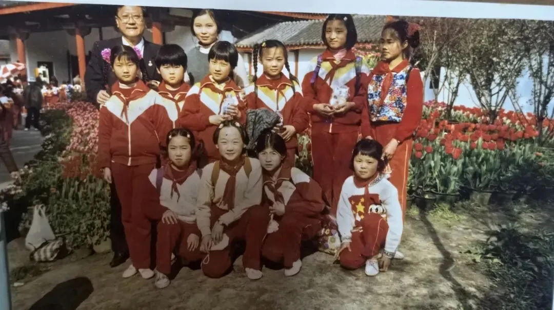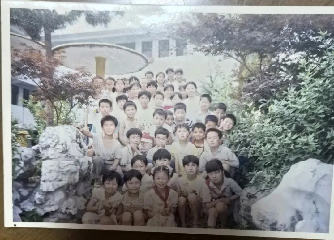 然后,王老师又拿出第二张小学集体照,这张照片里的人更多了,大家挤在假山和大树下,有的站着,有的坐着。