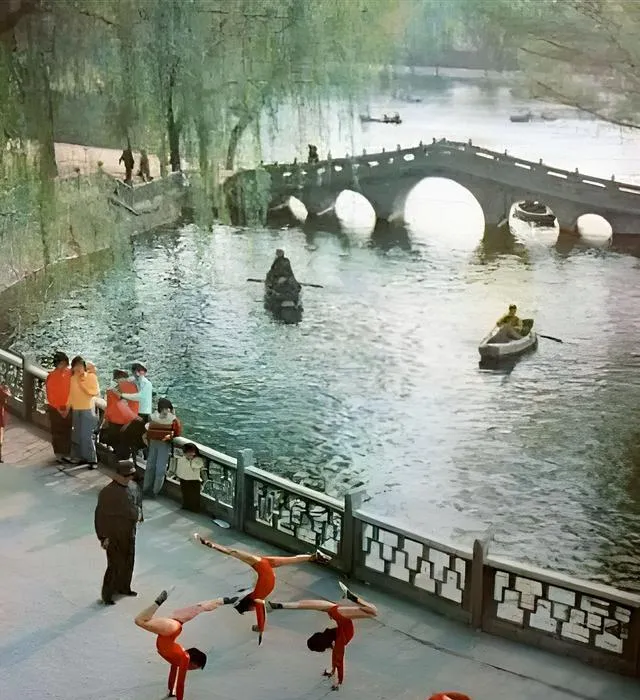 照片里的长安公园,柳丝垂水,湖上小船慢慢划,岸边一群孩子正压腿,动作齐整,老师拍着手喊口令,我小时候最盼周末来这里划船,回家时衣袖都是潮的,脸上却烫烫的。