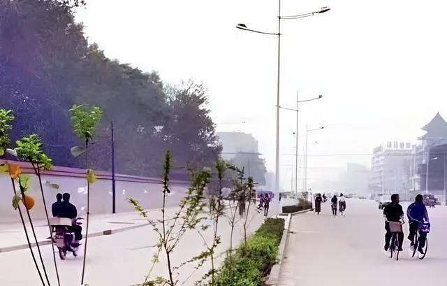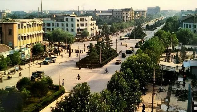 这张俯拍是中华大街,中间的环岛栽着松柏,四个方向的自行车像水一样涌进来,一眼望不到头的直线把城市骨架拉了起来,现在的车流更密了,绿化也更细致,老照片里的光影却显得厚重。