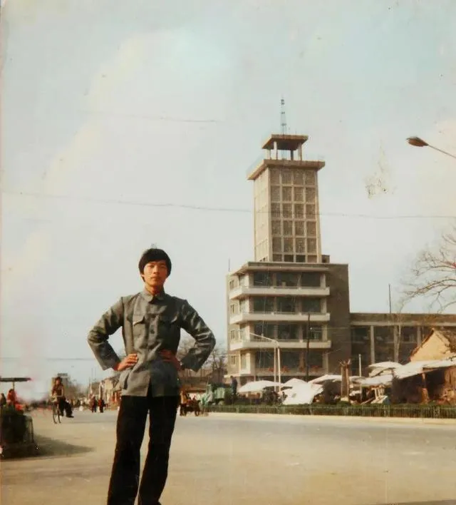 这个小伙子两手叉腰站得倍儿精神,身后是周口钟楼,旁边摊位支着油布棚,卖瓜子的香味顺着街往前飘,照相馆师傅说别眨眼,咔嚓一声就把青春定住了。