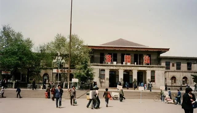 这张站前广场的老照片,石柱稳稳立着,牌匾上“洛阳”两字红得正,站前卖冰棍的小车往树荫底下一躲,人群不算多,赶车的人把车票攥在掌心里,怕风一吹就不见了。