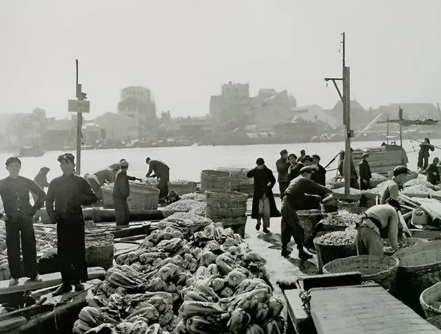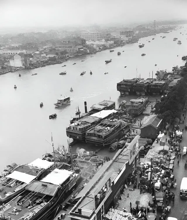 图中拥挤的艇只挤满江岸,这就叫老广州的码头,木甲板上堆着箩筐和麻袋,蒸汽船和机帆船混在一起,吆喝声盖过水声,装卸工肩上的汗把布衫都浸透了,爷爷指着类似的场景说过一句,“码头一响,广州就醒了”。