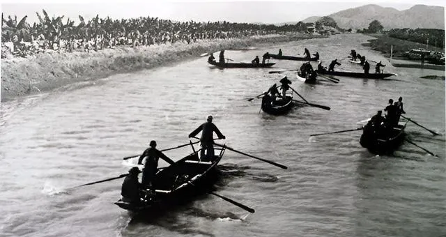 这一排小木船就是河里赶工,双桨齐划,岸上是成片的蕉林,雾气把远山压低了,人喊一声号子,水面就跟着颤一下。