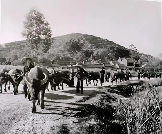 图中一群水牛沿着土路慢慢走,赶牛的人戴着大草帽,绳子在手里“嗒嗒”响,尘土被蹄子带起来,赶到集上,挑中就换钱。