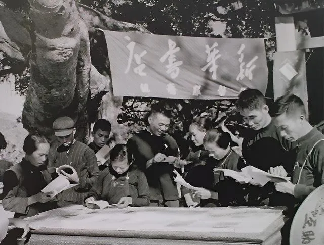 这张桌子叫流动书摊,横幅一挂,书一摆,村民里外三层地看,妈妈说过,以前一本连环画能传着看半个村。