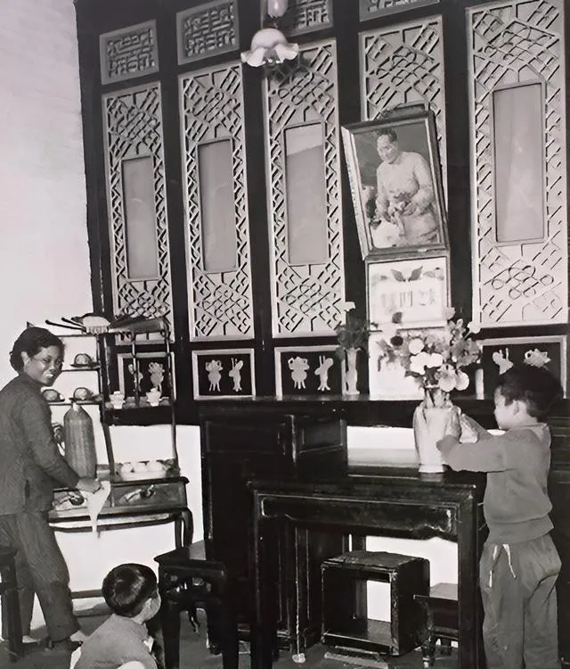 这家堂屋摆得讲究,屏风上雕着花纹,孩子站着擦花瓶,妈妈笑着抹桌角,手里的抹布一拧就是黑水,那叫过年的味道。