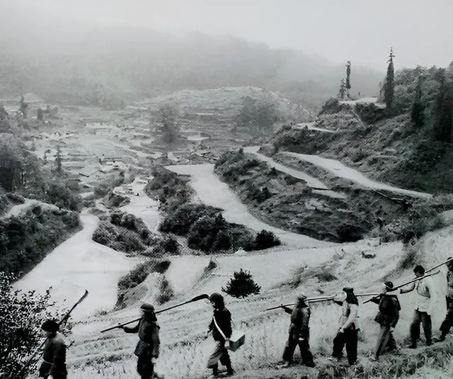 这条小径沿着梯田绕上去,肩上的锄头一上一下敲在肩窝里,人影被雾包住,走着走着就到山背那边了。