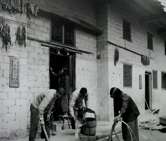 这是新房门口,几个人端着桶往地上浇灰浆,墙上晒着长条的作物,等硬了就是一片干净的院坝,孩子们能在这儿打陀螺。