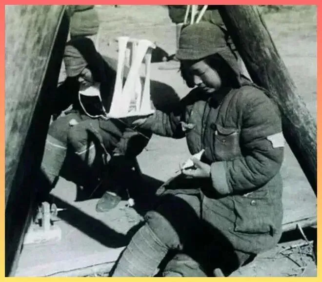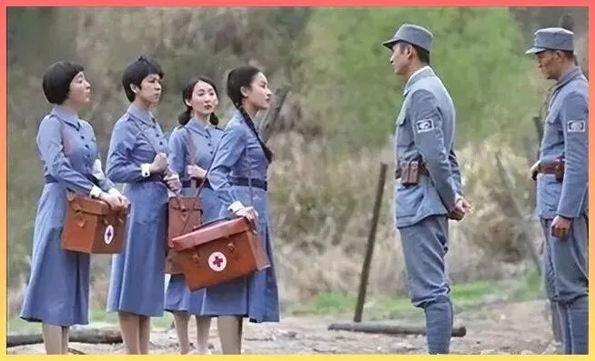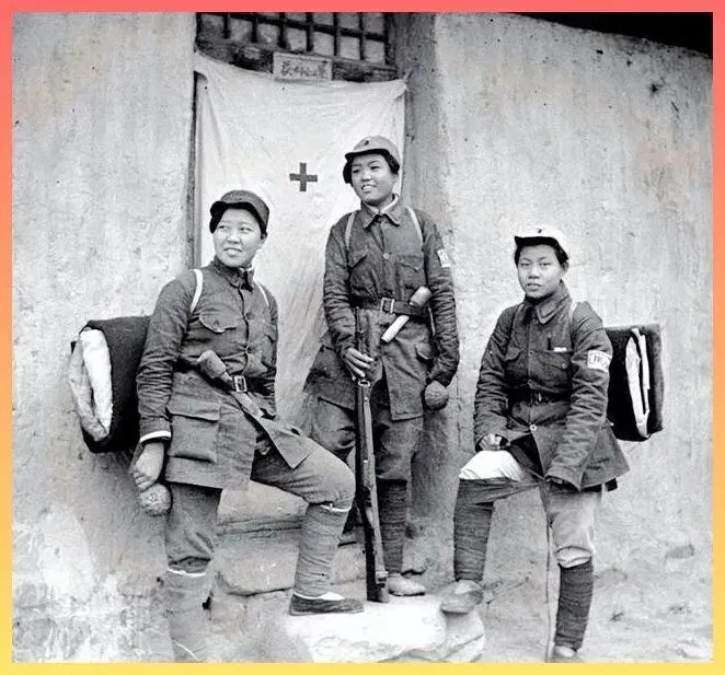 这是战地医院门口.的几位女卫.生员.。墙上挂着简陋的红十字旗,她们背着行囊,.随时准备转移.伤员.。在那个缺医少药的年代,她.们是用自己的双脚.和肩膀,在死神手里抢回了一条条生.命。 看着她们略显疲惫.却.坚定的神情,你还能说战争是儿.戏吗?