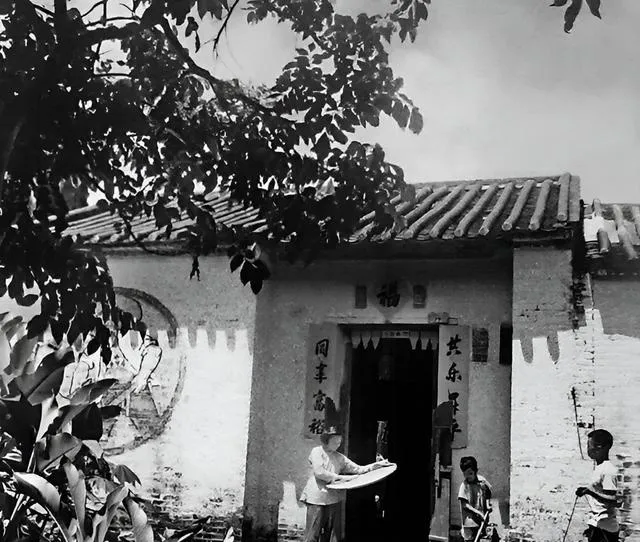 图中这处青砖小屋门额写着“福”字,墙上还刷着宣传画,门口竹篮晾得满满的,阿叔把大簸箕端得稳稳当当,屋檐下阴凉处最舒服,孩子们凑过来看热闹,像极了我外婆家院口的午后。