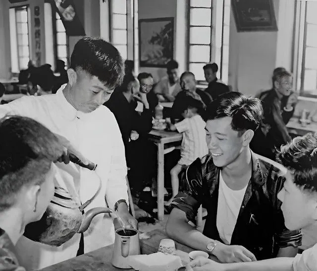 图中铝壶细嘴长,师傅抬腕高冲,滚水落进搪瓷杯里直冒白气,几位年轻人笑着搭话,老广喝茶讲究一个叹字,先叹口气,再把杯沿上的茶渣刮一刮,慢慢呷。