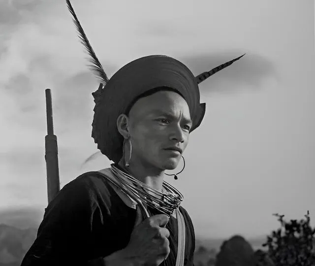 这个小伙戴着高高的帽翅,脖颈绕着银圈,肩背木枪,眼神很亮,山风从他身侧掠过,照片静却不冷,像把山路上的松香都留住了。