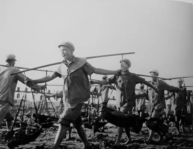 这张挑担的照片最有劲,扁担压得弯弯的,脚下是泥,脸上是笑,队伍一字排开唱着歌,汗水混着海风,咸里带甜。