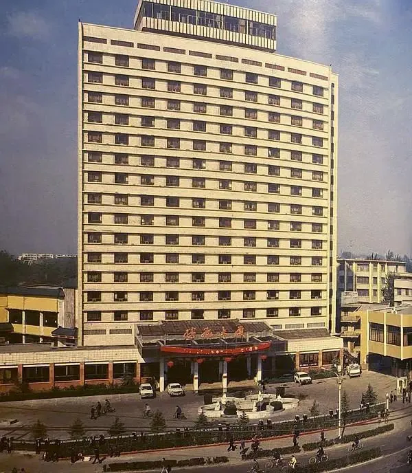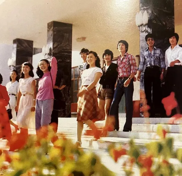照片里这些小伙姑娘笑得真敞亮,衬衫挽袖子,裙摆在光里一晃一晃的,门柱是黑色大理石,反光里能照见人影,妈妈看见这张说那会儿的礼拜天,最盼朋友约在宾馆门口聊会天。
