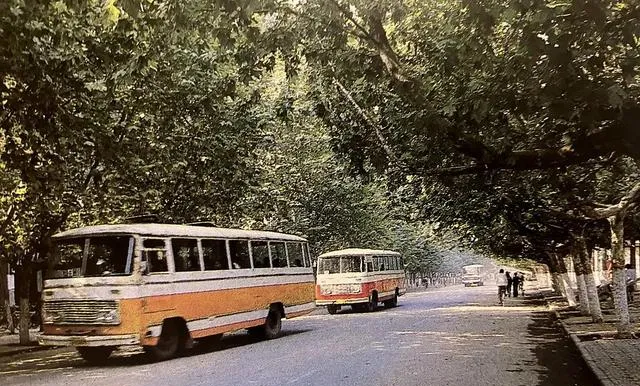 两辆橙白相间的公交一前一后,车窗拉着灰色窗帘,司机胳膊搭在窗沿上,路两边的梧桐把天都盖住了,树影在车身上刷一下又一下,爸爸说那会儿的车票一角钱,够买一根冰棍了。