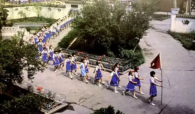 队旗一挥,小同学们沿着小桥排成一串,白衫蓝裙走得整齐,歌声从树缝里钻出来,绕着假山转一圈,老师在前面回头看,挥手让大家慢点。