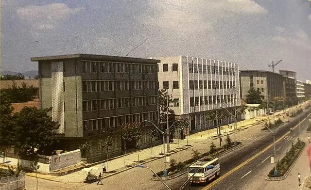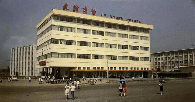 这栋写着红色招牌的楼叫友谊商场,玻璃橱窗里摆着收音机和缝纫机,门口的自行车一排排停得服服帖帖,外头太阳晒,里头风扇呼呼转,售货员阿姨把码放整齐的柜台擦得亮亮的。