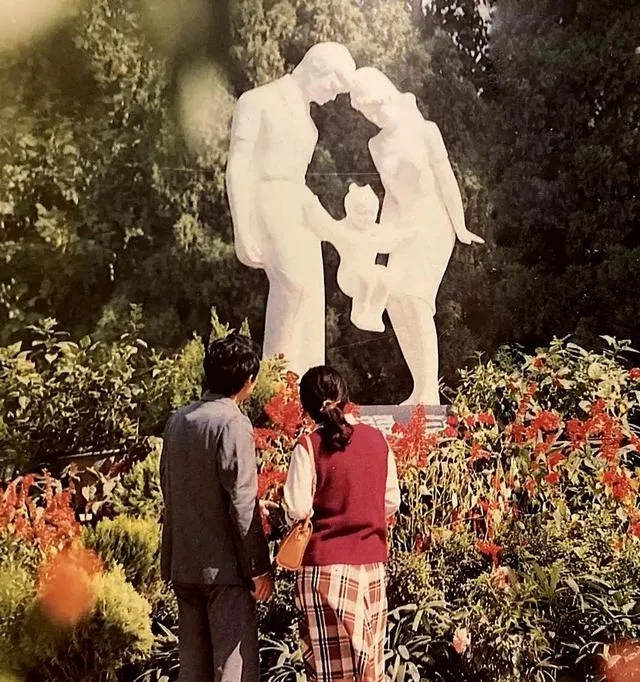 这尊一家三口的雕塑被绿篱围着,父母低头看娃,手臂弯里留着温柔的空,情侣站在前面拍照,风吹过来花穗蹭着裤脚,照片的颜色温温的,像刚晒过的床单。