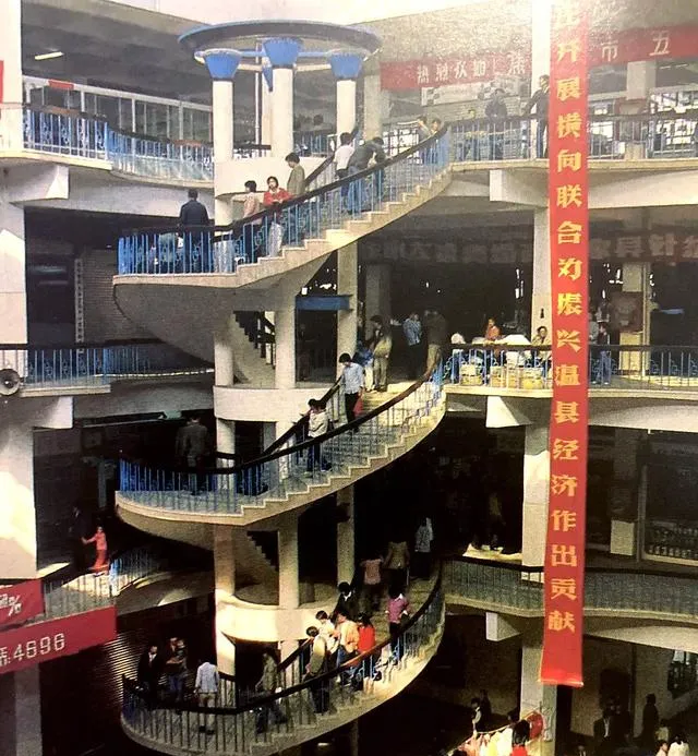 楼里这条旋转楼梯绕着中庭盘上去,扶手是蓝色的,手心一握凉凉的,楼上卖衣裳楼下卖电器,吆喝声从一层飘到三层,奶奶拽住我说别乱跑,转多两圈准得找不着人。