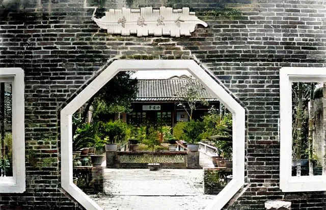 这段青砖墙上镶着六边形门洞,边框刷着白线,门楣是一片芭蕉叶形的匾,四字“介然竦峙”刻得瘦劲,走过去不急看景,先被门洞的留白勾住了眼,现在很多园林也爱做借景,这里算是祖师爷。