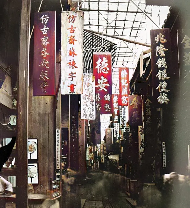抬头尽是铺号招牌,漆成红黑相间,一块挨一块,药铺、银号、布庄齐齐挂着,脚底下是窄巷,烟火气卷上屋檐,我小时候在类似的老街逛过,妈妈一抬手指牌匾说这家“跌打”有名,买点药油回去擦一擦。