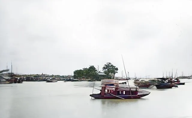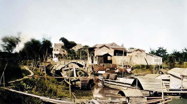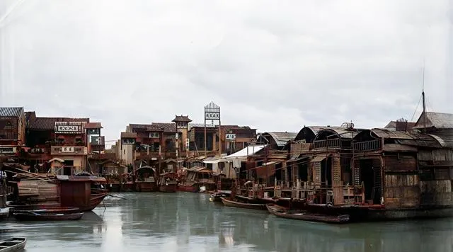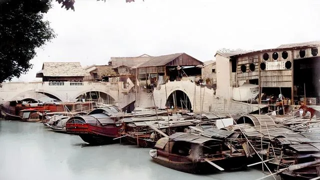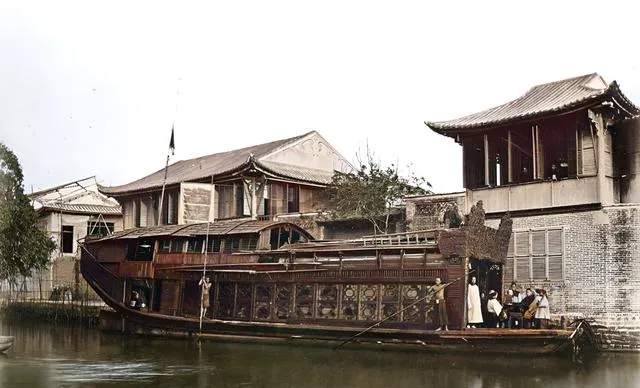 这一条木壳花船停在水边,船舱镶着细格窗,里面透出灯影,岸上有穿长衫的人靠着栏杆聊天,老照片里常见这种水上青楼的身影,现在河面干净利落,留下的是故事里的喧闹。