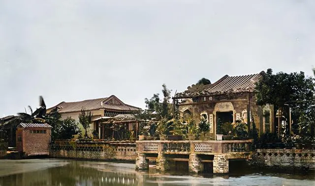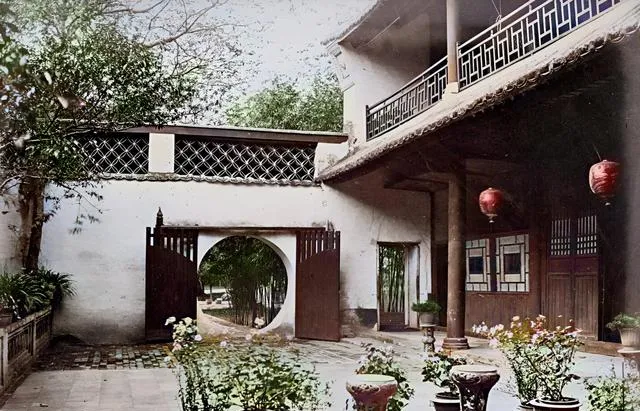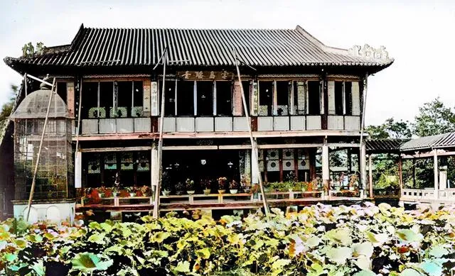 两层木楼前是一池子荷花,叶子挤着叶子,楼廊栏板上摆了许多盆栽,这种大户人家的园子讲究四时有景,能坐能看能请客,后来渐渐寂落,照片里却还热闹。