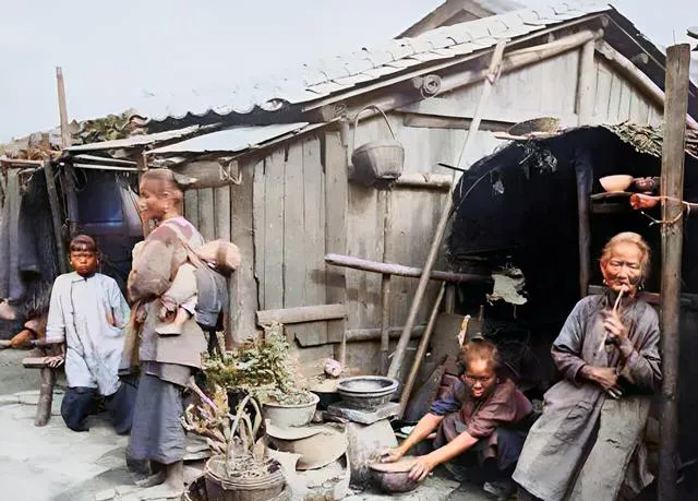 木板钉的屋子,锅灶摆在门口,老太太靠柱子抽着旱烟,小孩在脚边打盹,画面里没有修饰,日子却很真,妈妈看这张只说了一句,“以前苦,现在好好过”。