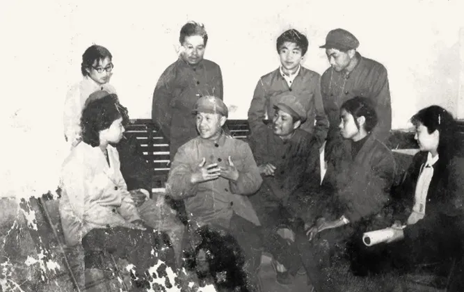 上图为1980年秋天山东省京剧二团来桓台影院演出期间,利用业余时间,省剧团演员与县文化馆、公社文化站人员召开座谈,会后在文化馆院子的合影。下图为著名京剧艺术家方荣翔(前左二)向县文化馆人员传授京剧表演技艺。 (照片提供者:李允堂)