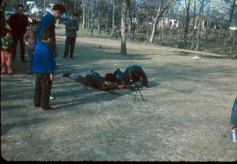 80年代公园草地,几个孩子正在玩耍,其中一个孩子趴在地上操作一架带三脚架的玩具重机枪。