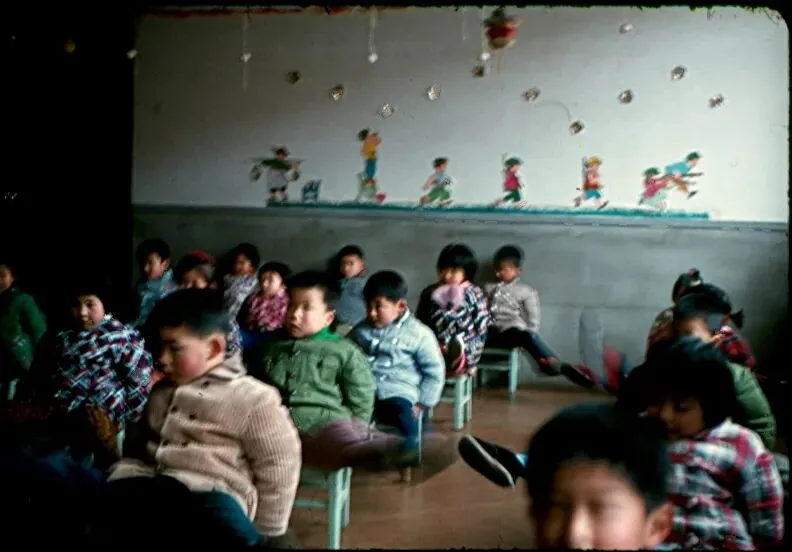 80年代幼儿园室内,一群孩子穿着厚重的棉衣棉裤坐在小椅子上,墙上画着儿童列队的壁画。
