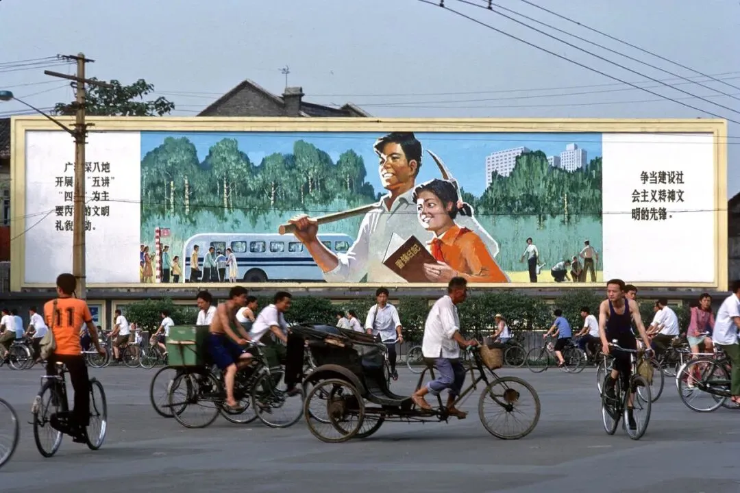 81年青岛街头,巨幅“五讲四美”宣传画下,大量市民骑自行车经过。