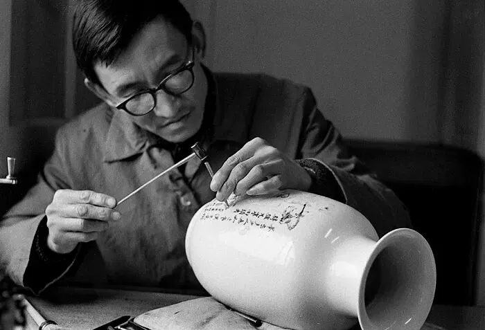 80年代工厂车间,一位戴着黑框眼镜的师傅正在专注地进行瓷器刻字。