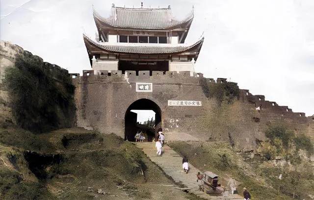 图中高大的城门叫瞻峨门,厚厚的夯土城垣嵌着拱洞,门额两字醒目,石阶被脚底磨得发亮,挑担的、赶车的、打伞的都从这里进出,一座城的脉搏在门洞里呼吸。