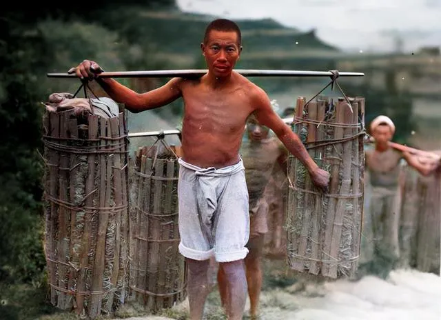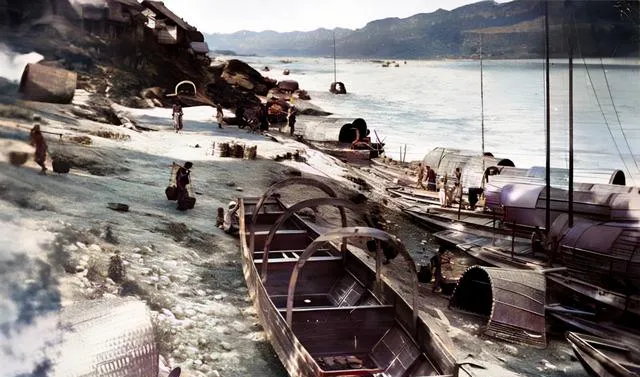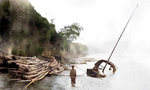 这张让人心里一紧,江边躺着被凿沉的小船,桅杆歪着,岸上还有叠起的木排,站着的军人影子冷冷的,船是命,没船就没生计,那会儿为了不被征用,只能自己先下手。