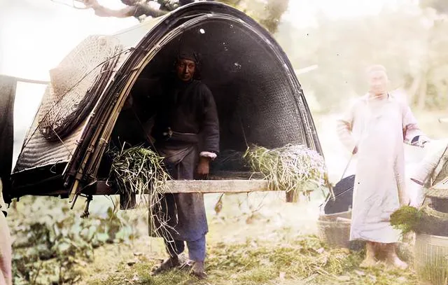 这个弧顶的东西叫鸭棚子,两头木框托着,下面铺草,挑起来就能走,放鸭子的人困了能在里面打个盹,轻便得很,像一座移动的小屋。