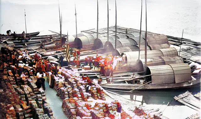码头边挤满货担,彩色篾箱堆成山,篷船一字儿排开,商贩吆喝,秤砣在空中哐当一声落下,江风把衣襟吹得鼓鼓的,以前赶集靠脚力和水力,现在物流一个电话就到。