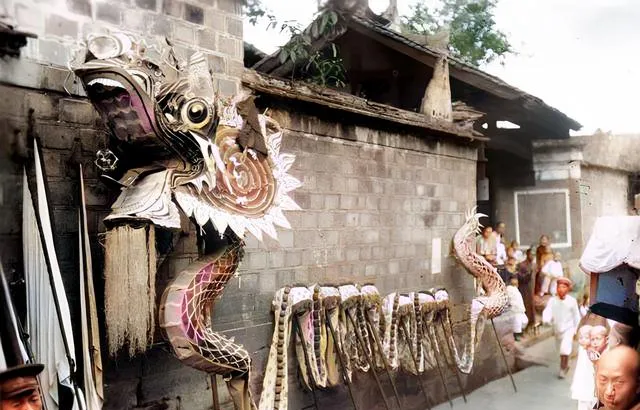 墙边的一条大龙靠着休息,龙头张着口,纸鳞片泛着光,孩子围在旁边看热闹,巷口的军人举着手维持秩序,锣鼓一停,空气里还残着回响。