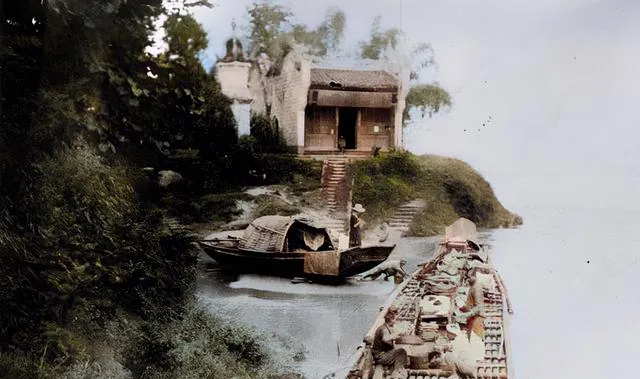 最后这一张,是江边的一片屋舍,树把屋檐拥得严严实实,远处的水亮得像银纸,日头慢慢偏过去,影子长到田畔,以前的人把日子过在水边,现在的人把回忆放在图里,也挺好。