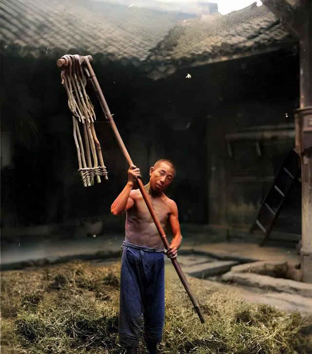 这个木家伙叫连枷,挥起来啪啪响,打在黄豆秧上,豆粒跳出来在地上乱蹦,汗水顺着脊背往下淌,男人抬手抹一下,继续抡,就是这么实在。