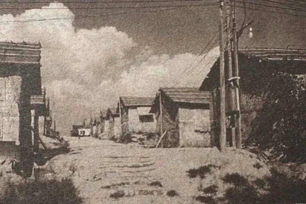 照片里那条窄窄的土路,如今再看不过几步宽,可在当时,却是我们进出东山岭的唯一通途。下雨天泥泞不堪,深一脚浅一脚地走,胶鞋上沾满烂泥,重得抬不起脚;晴天则尘土飞扬,车一经过,漫天黄沙能把人裹成“土人”。路两旁的平房,是我们趁着暴雨和台风的间隙抢建的,墙是土坯混着碎石砌的,屋顶盖着油毡和茅草,虽然简陋,却成了我们在异乡最安稳的家。