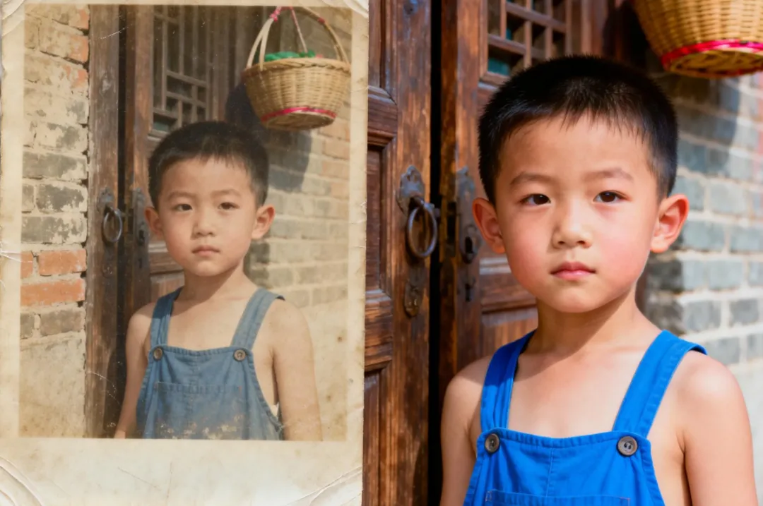 原本模糊不清、甚至有点泛黄的照片,瞬间变得清晰无比,连我小时候衣服上的扣子都看得清清楚楚,甚至还自动上了色!