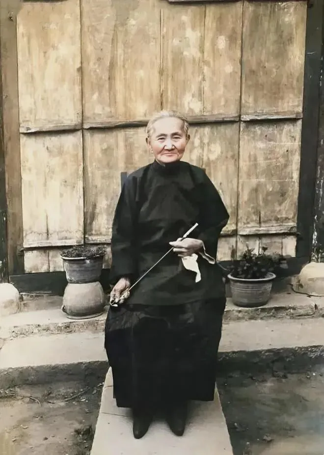 老太太手里拿着烟杆和手绢,脚上那双小鞋干干净净,瞧着就知道过日子精细。虽然头发都白了,年纪也有七十好几,面相却温和得很。看她那副慈眉顺眼的模样,和咱们平常听说的刻薄地主娘子完全对不上号。