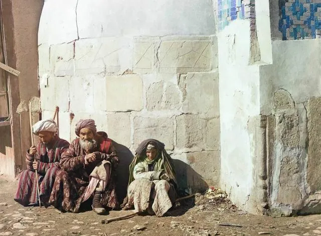 这张是街角的午后,三个人坐在墙根,披着花纹的长袍,拄着木杖,阳光从拐角斜过来,影子把墙面切成两半,妈妈说,晒太阳是旧时光里最便宜的享受,现在大家晒的是屏幕。