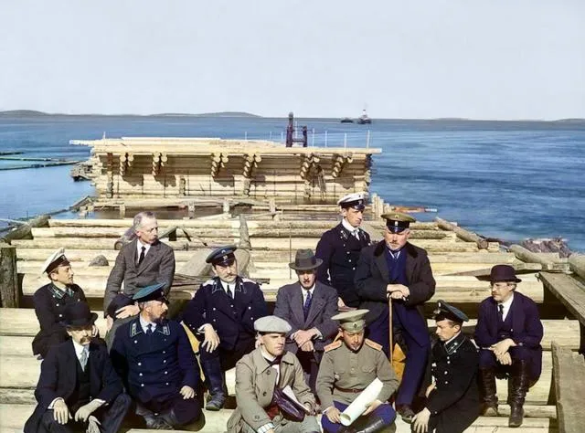 这群人坐在木排上,军装和便装混在一起,手里拿着图纸,脸上是阳光下眯起的认真,一张合影把建设的劲头装住了,要不了多久,这里就会停靠大船。