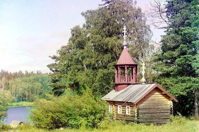 这座木头小教堂颜色温柔,红顶小塔顶着十字,周围是密密的白桦和云杉,木墙上有岁月留下的浅痕,安静又可人。