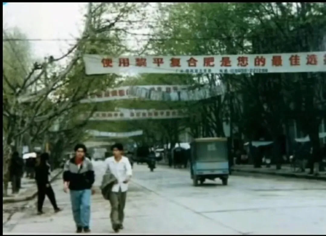 一幅巨大的、带有时代特色的复合肥广告横幅,横跨在平街上空。广告词可能直接响亮,配色鲜明。横幅之下,道路两侧的梧桐树更为粗壮茂盛,它们见证的不仅是季节,更是从农业社会迈向工商业社会的宣传标语。