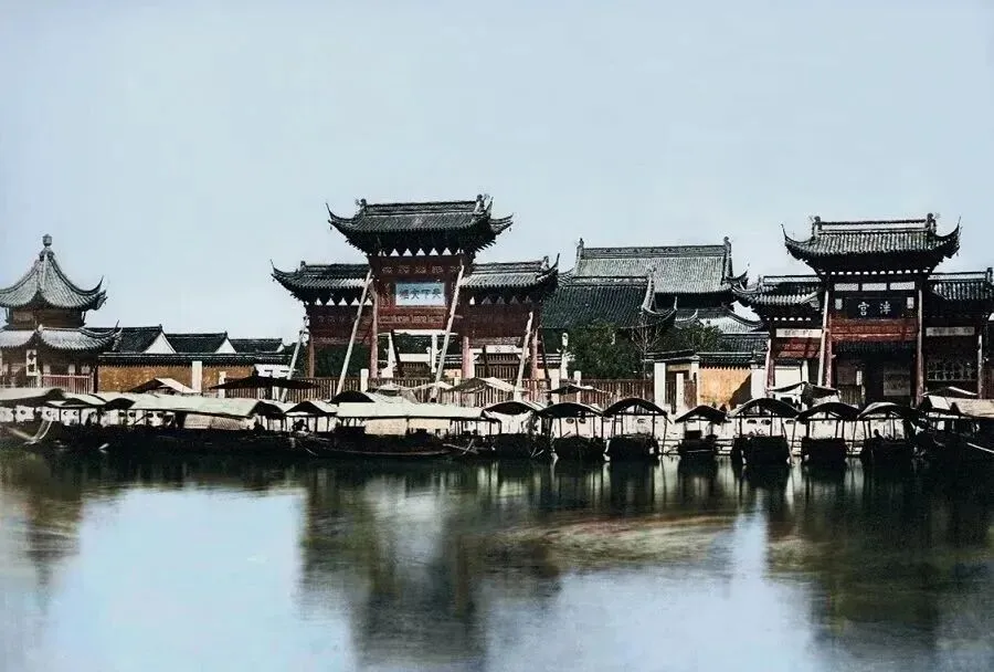 水面倒映着建筑的样子,其实还藏着当时秦淮河的“活法”。那会儿没有现在的马达船,水上跑的都是摇橹的画舫和货船,船一动,水面荡起波纹,建筑的影子跟着晃,配上船头挂的灯笼(尤其是晚上),那会儿秦淮河的水质可比后来好多了,沿岸人家甚至直接在河边淘米、洗菜,码头边还有挑夫忙着搬卸货物,整个河沿儿都是活泛的烟火气。