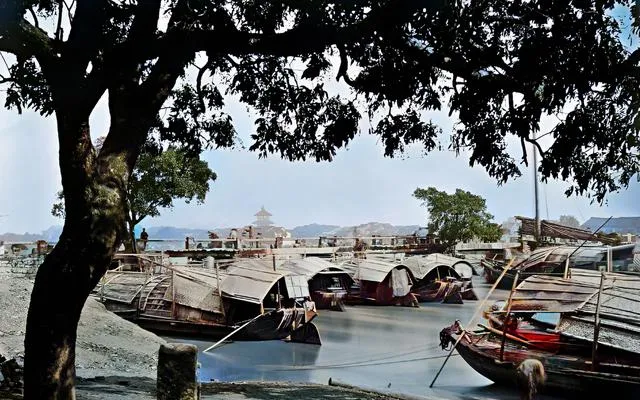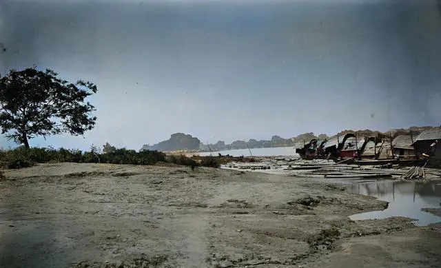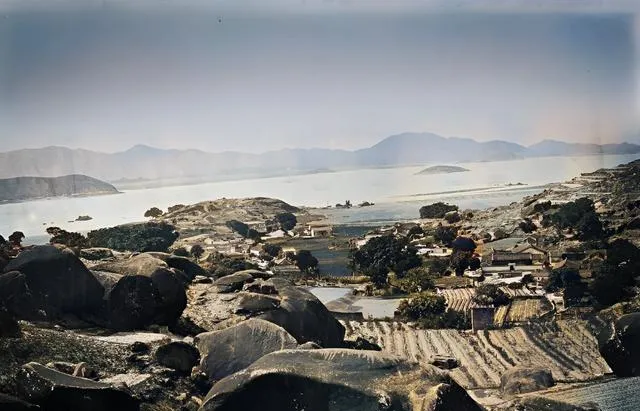 从高处望下去,江湾像一弯银色的镯子扣在城边,大小船只在水面上排成细线,岸上屋顶层层叠叠,树冠把街道遮得严实,远处山色淡蓝,奶奶看了照片说像旧年画,可那时候的人家可没滤镜,风一吹,屋脊上的灰都会响。